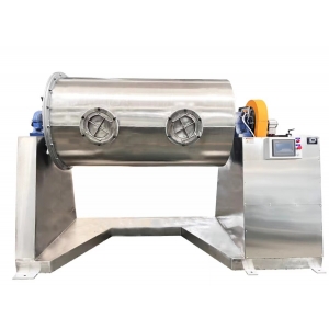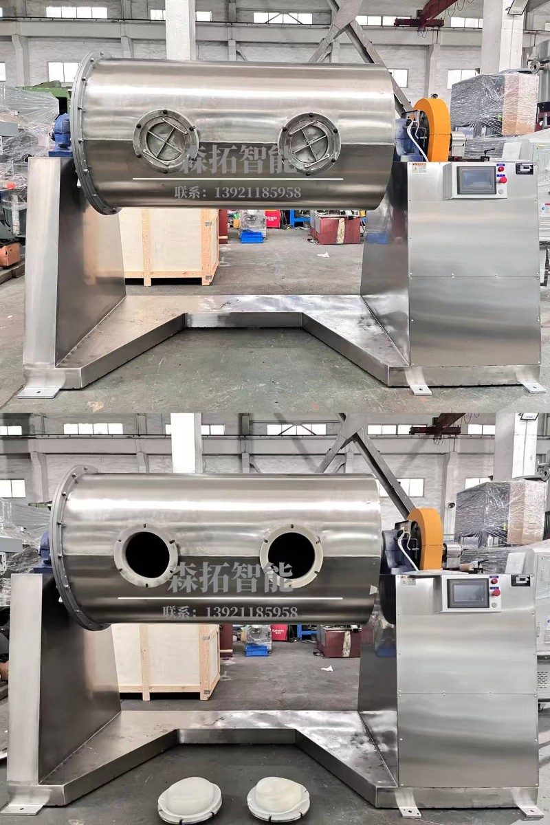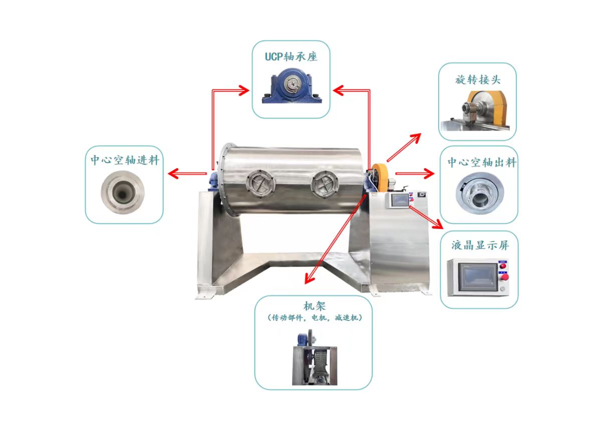 本設備構成為鋼結構機架,長圓型研磨桶,單個或兩個圓形或長條形口(同為加料出料口),軸承支撐組件,硬齒面減速機,驅動電機,電控系統構成;具備研磨過程無滲漏,處理量大的特點,電控系統配合剎車電機以及進、出料點動定位裝置,可選配準確定位加、出料口在停機狀態下的相對位置,方便后期運行時的裝料和卸料對接工作;本機研磨桶體采用焊接加工后鏜加工兩端主軸的方式,以及加粗型支撐傳動主軸,可有效避免后期因制作工藝問題導致的斷軸風險。