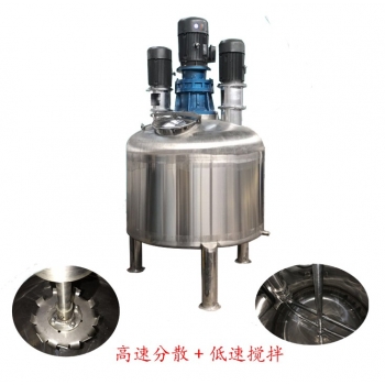 FS高速分散攪拌釜是由一個低速錨框式攪拌和兩個高速分散攪拌機組成,實現雙軸高速分散功能、低速強力攪拌、刮壁粘稠物料,三個電機安裝在封頭機座上,同時分散攪拌,多功能工藝一體完成,高剪切、分散、攪拌、溶解,調勻混合。