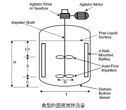 攪拌器的作用使顆粒或團聚體分散并懸浮在液體中,形成均勻懸浮或者漿液。應用于制備固體反應物漿液和催化劑漿液,然后進入下一個反應器;或者僅僅使固體分散成顆粒懸浮在液體中。