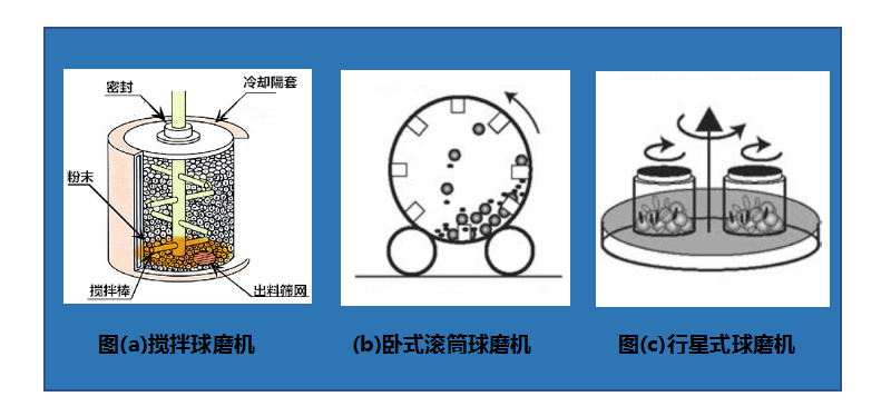 通常實現金屬粉末機械合金化的球磨裝置主要有以下幾種:攪拌球磨機、滾動球磨機、行星式球磨機和震動球磨機,如圖所示。其工作原理如下: