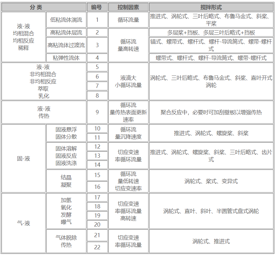 互溶液體的混合是一個均相純物理混合過程,主要控制因素是循環速率,而槳葉的剪切作用是次要的。當兩種液體粘度相差較大時,剪切的存在有利于較高粘度液體在整個容器內的分散,有利于湍流擴散的強化。常用的攪拌器有推進式、斜葉渦輪、長薄葉螺旋式、三葉后彎式等。