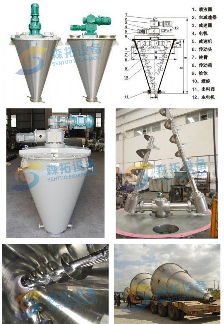 SLH型雙螺旋錐形混合機(jī)由傳動(dòng)部分、筒蓋、螺旋、筒體、出料閥等組成。