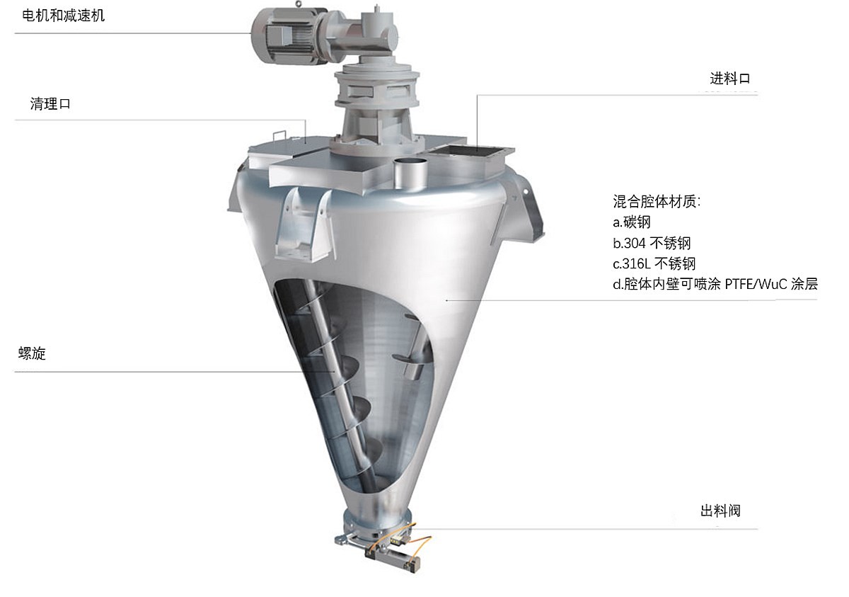 3、螺旋部分:筒體內(nèi)兩只非對稱排列的螺旋作自、公轉(zhuǎn)行星運(yùn)動(dòng)時(shí),在較大范圍翻動(dòng)物料,使物料快速達(dá)到均勻混合。